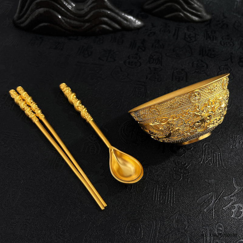 古法实心衣食无忧黄金碗筷摆件国潮传承吉祥三宝龙凤呈祥婚嫁礼品婚庆摆件/3件