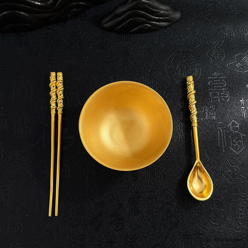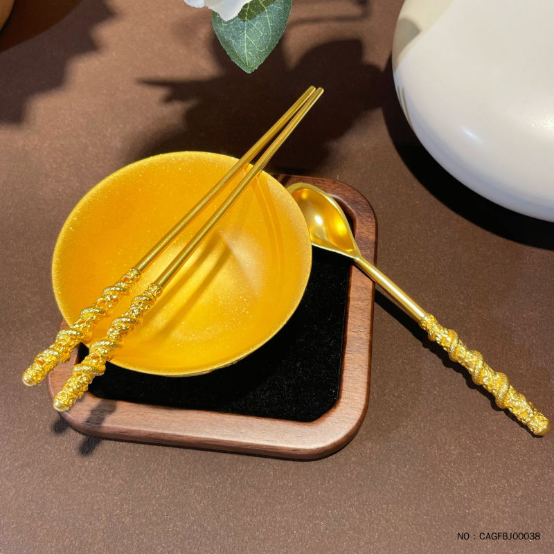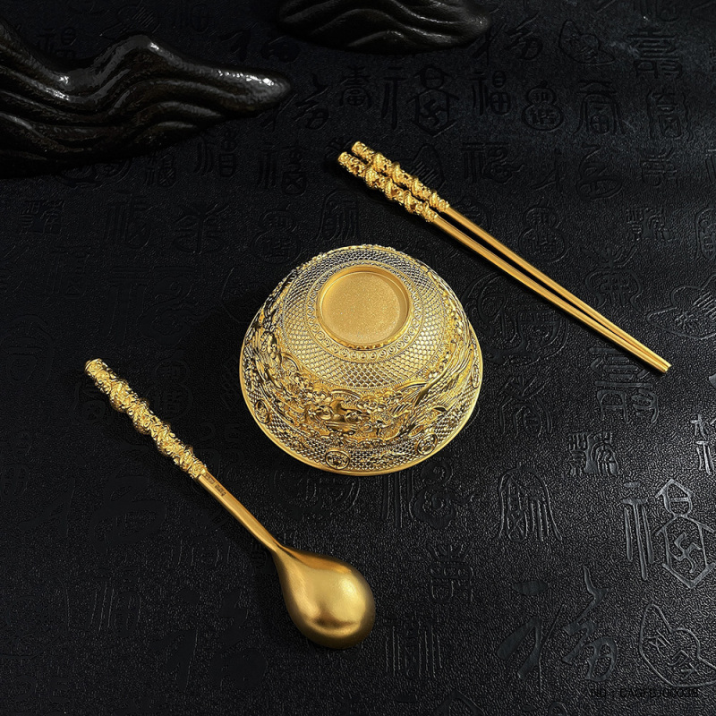 足金999古法实心衣食无忧黄金碗筷摆件国潮传承吉祥三宝龙凤呈祥婚嫁礼品婚庆摆件/3件